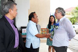 SBMA Chairman and Administrator Roberto V. Garcia welcomes Jose Carlos Martins, executive officer for ferrous minerals operations of the Vale Shipping Holdings Pte. Ltd. (VSH), during the June 1 ceremonial launch of the Vale iron ore transshipment operations in Subic Bay. Looking on, at left, is SBMA director and treasurer Joven D. Reyes.
